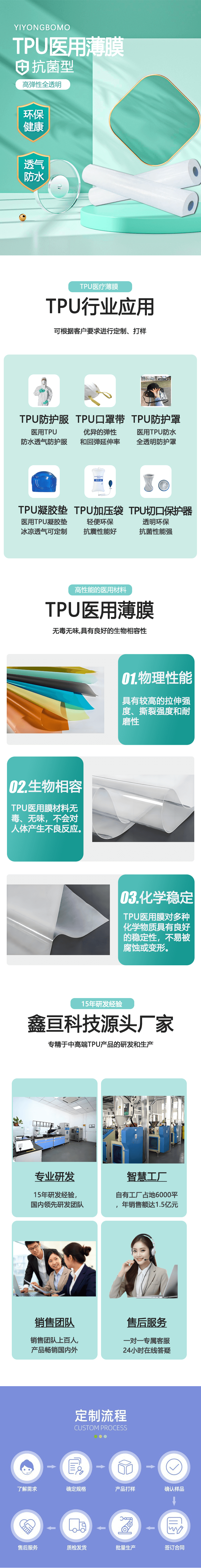 專業(yè)生產(chǎn)TPU膜20年,提供高彈性TPU薄膜、醫(yī)用級TPU膜、防水透氣膜等全系列產(chǎn)品。作為通過ISO9001認證的TPU膜生產(chǎn)廠家,我們擁有先進的熱塑性聚氨酯膜生產(chǎn)線,支持定制厚度(0.01-3mm)、顏色和功能(抗UV/抗菌/導(dǎo)電)。免費提供樣品和技術(shù)參數(shù)表,24小時響應(yīng)您的TPU薄膜采購需求。